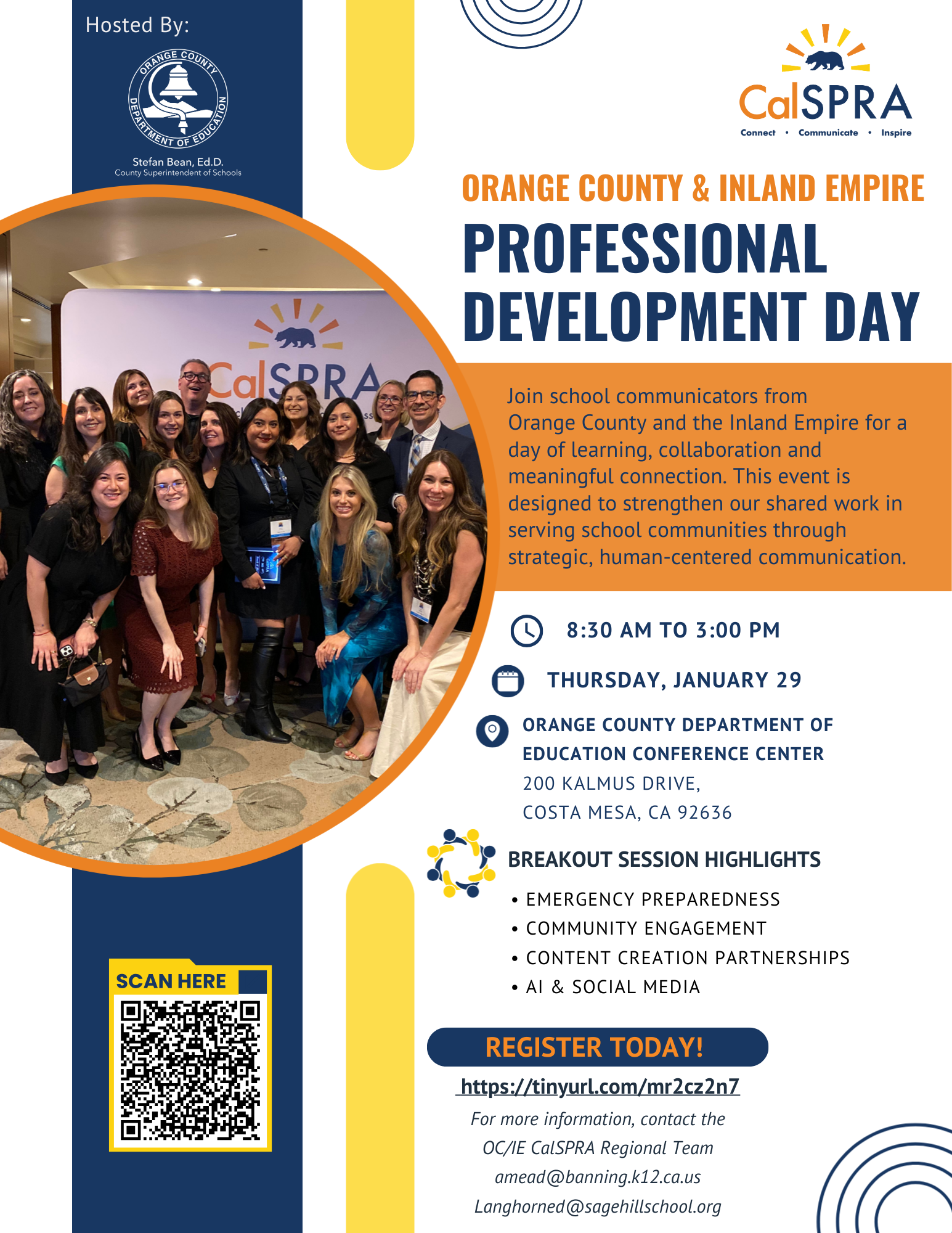 The OC/IE Professional Development Day, hosted by the Orange County Department of Education, will bring together communications professionals from across the Orange County and Inland Empire regions for a full day of learning, collaboration, and connection. This event is designed to strengthen our collective capacity to serve school communities through timely, strategic, and human-centered communication. Attendees will engage in four breakout sessions covering crisis communication, community engagement, social media strategy, artificial intelligence, emergency response, storytelling, and more—each session crafted to deepen skills and build meaningful connections with colleagues across the region. United under the theme Connection, this day will foster shared insights, inspire new approaches, and reinforce the powerful impact communication professionals make every day.